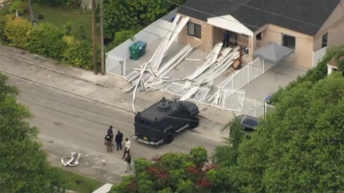 Aerial footage showed officers and an armored police vehicle outside the home after the standoff, with the home’s fence knocked down.